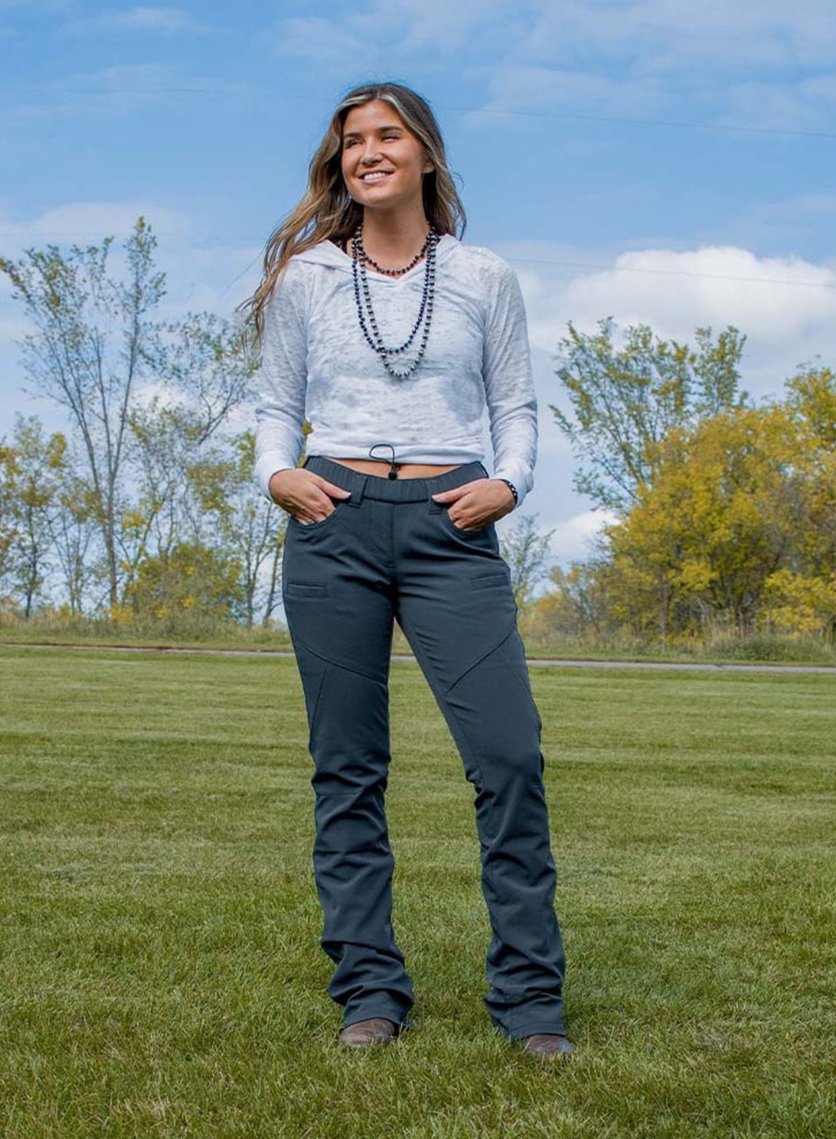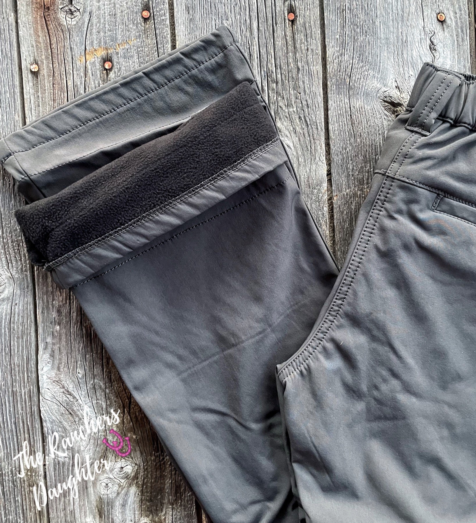 Cowgirl Tuff Work Hard Play Hard pants are now an easy pull-on style with wide elastic waist and an adjustable drawstring for that perfect fit along with open front and back pockets and seven standard belt loops. They are still a very sleek style that is pure comfort and very flattering with two sleek front cellphone pockets. They entail ultra-amazing, thin, microfiber lined stretch that everyone loves. They are wind, water, and cold resistant. These pants have proven themselves as a must have staple in everyone’s closet!!!Get yours today and see why so many have two or three pairs!!!