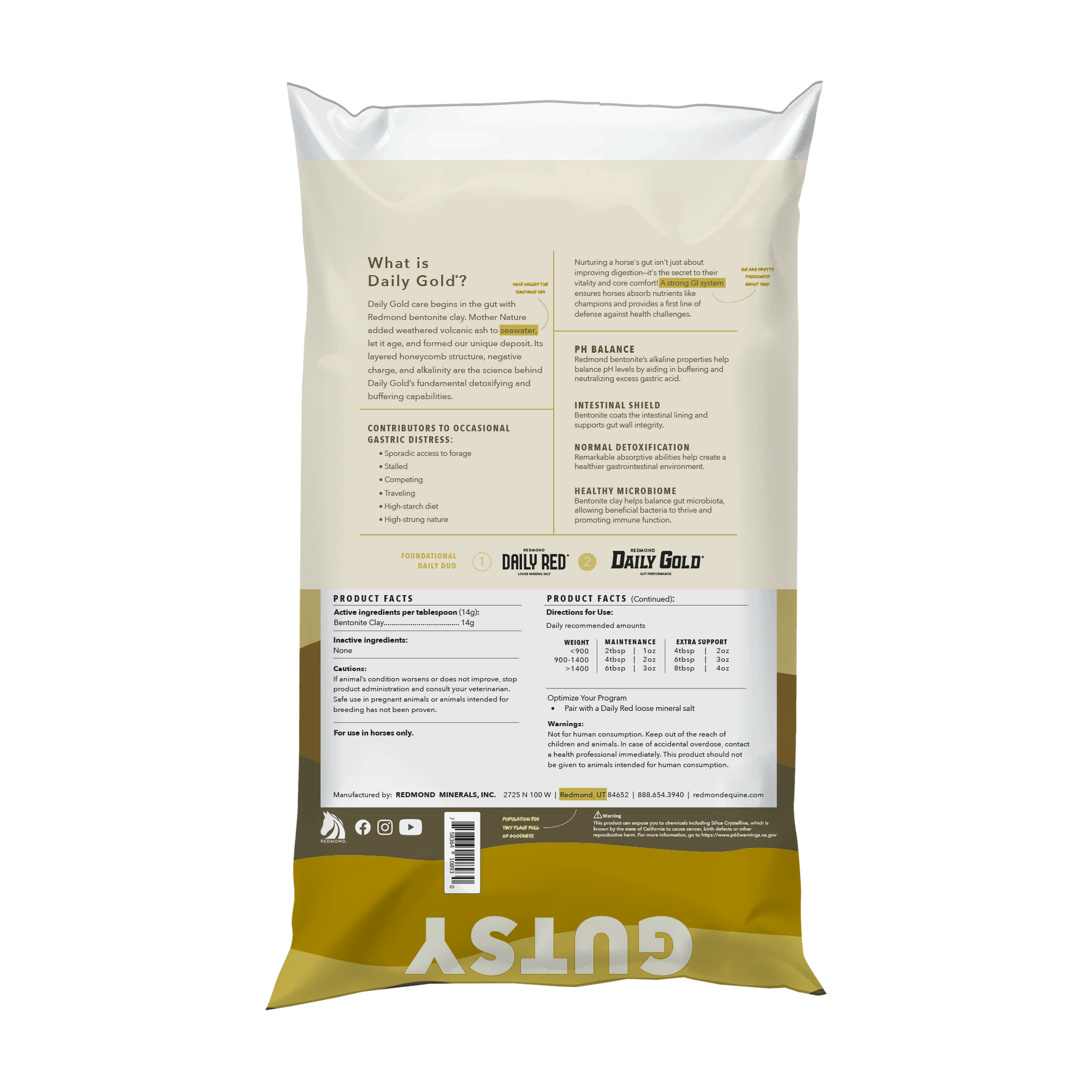 Nurturing a horse’s gut isn’t just about improving digestion—it’s the secret to their vitality and core comfort! Daily Gold care begins in the gut with Redmond bentonite clay. Its layered honeycomb structure, negative charge, and alkalinity are the science behind Daily Gold’s detoxifying and buffering abilities. Whether you have a healthy horse you want to maintain or one that needs a little more care, Daily Gold will help your partner look and feel better from the inside out.