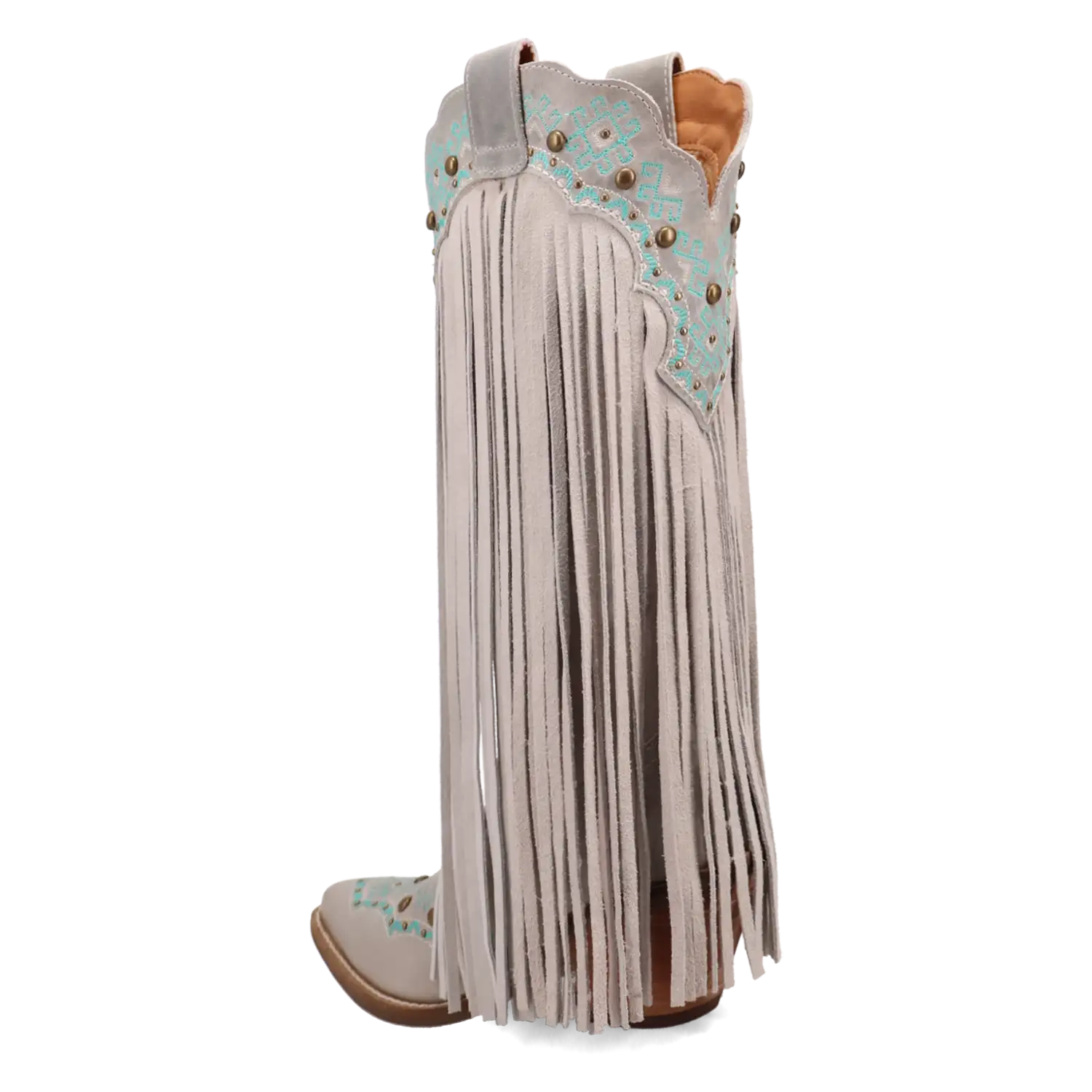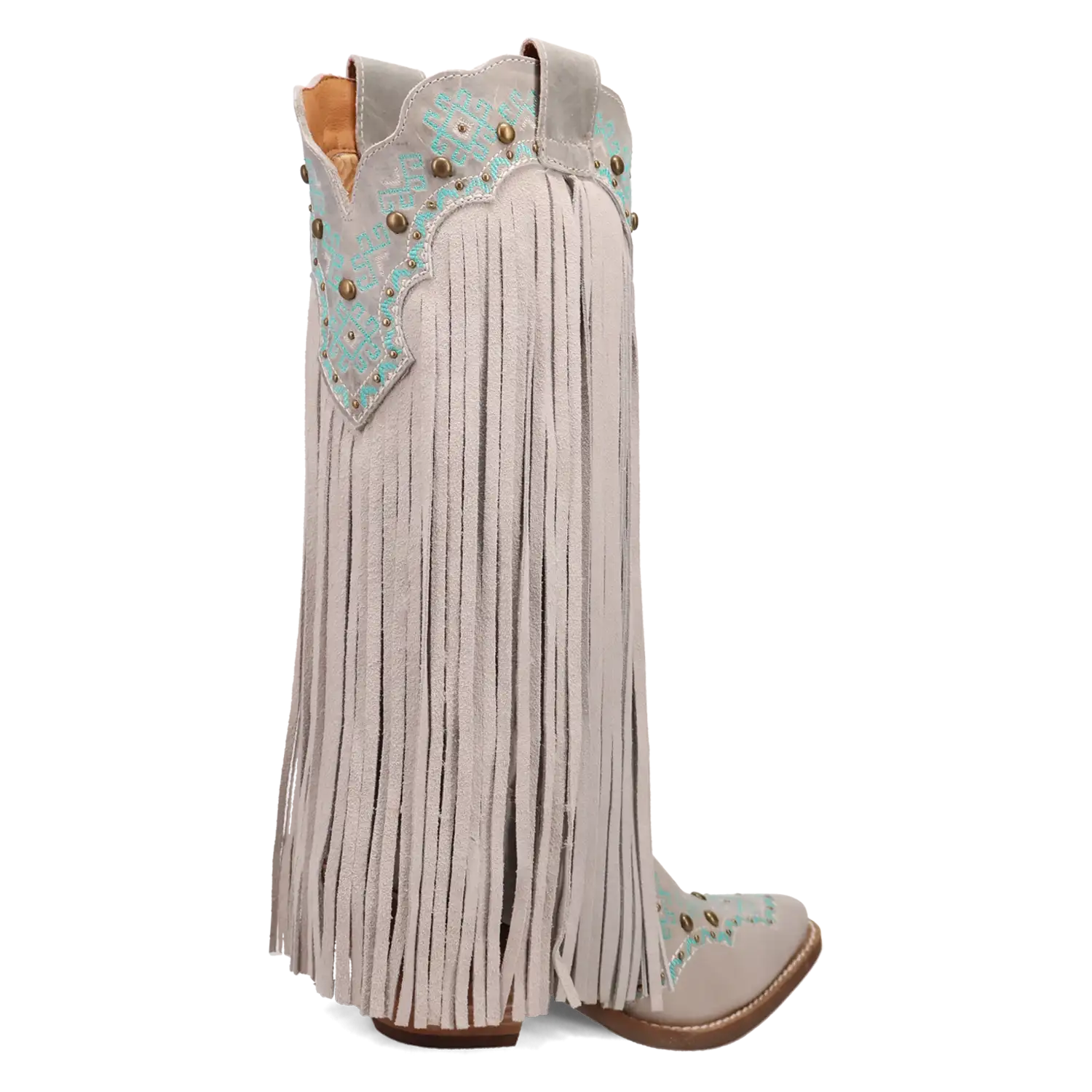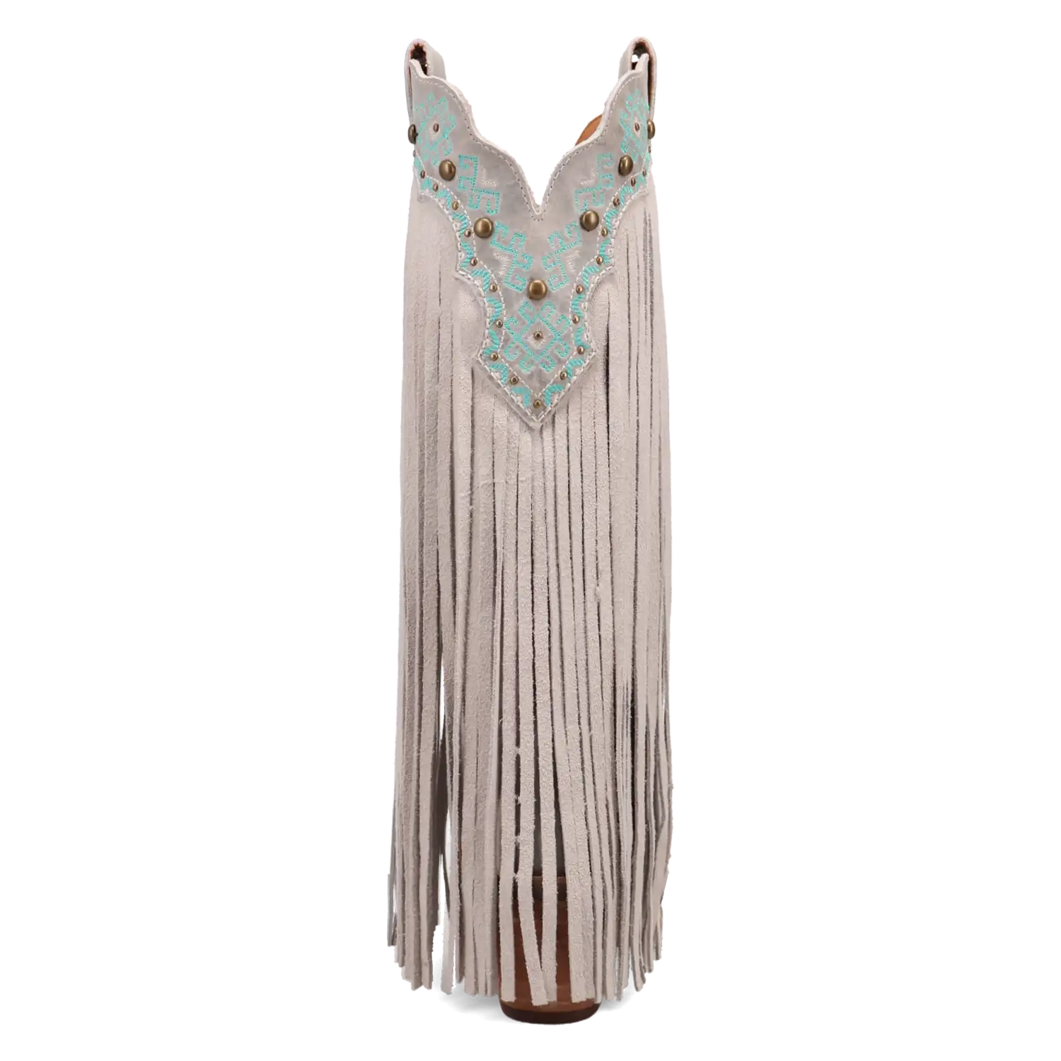 Make a bold entrance wherever you go with the Dingo Tequila Sunrise boots—designed for women who love to stand out with confidence. Made from rich suede leather, these boots feature cascading fringe that flows with every step, giving you a free-spirited, eye-catching look. The exquisite turquoise embroidery along the top of the shaft and toe adds a striking pop of color, while the studded details bring a touch of edgy glam. Available in various colors, you can find the perfect pair to match your unique style.