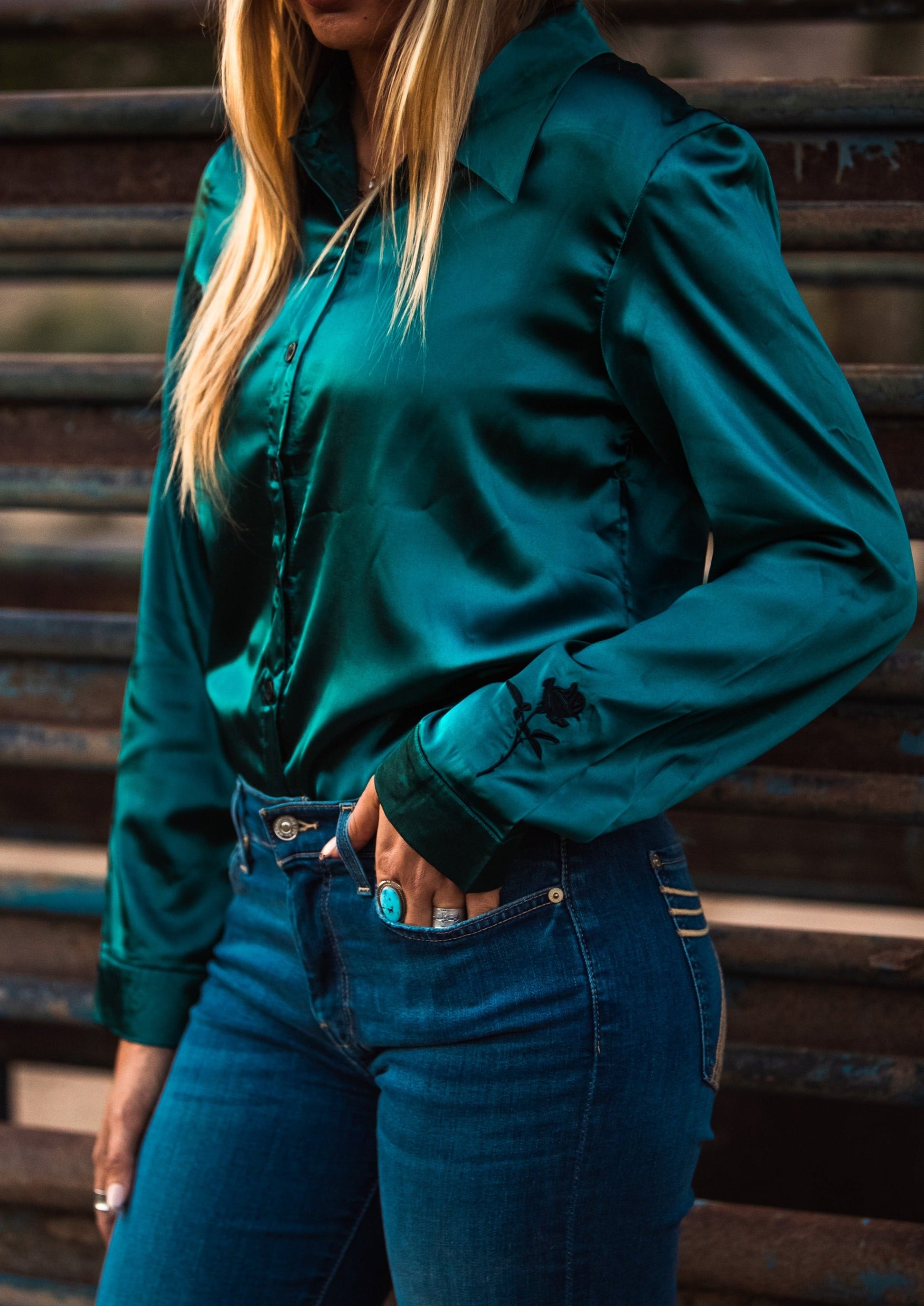 This Ivy's Rose rodeo shirt is made with poly satin fabric. They are soft, durable, lightweight and comfortable. The arms and body are designed to have extra length to ensure they do not ride up while you’re riding. Follow the measurements below to get your desired fit. Don’t miss our signature rose on the sleeve!