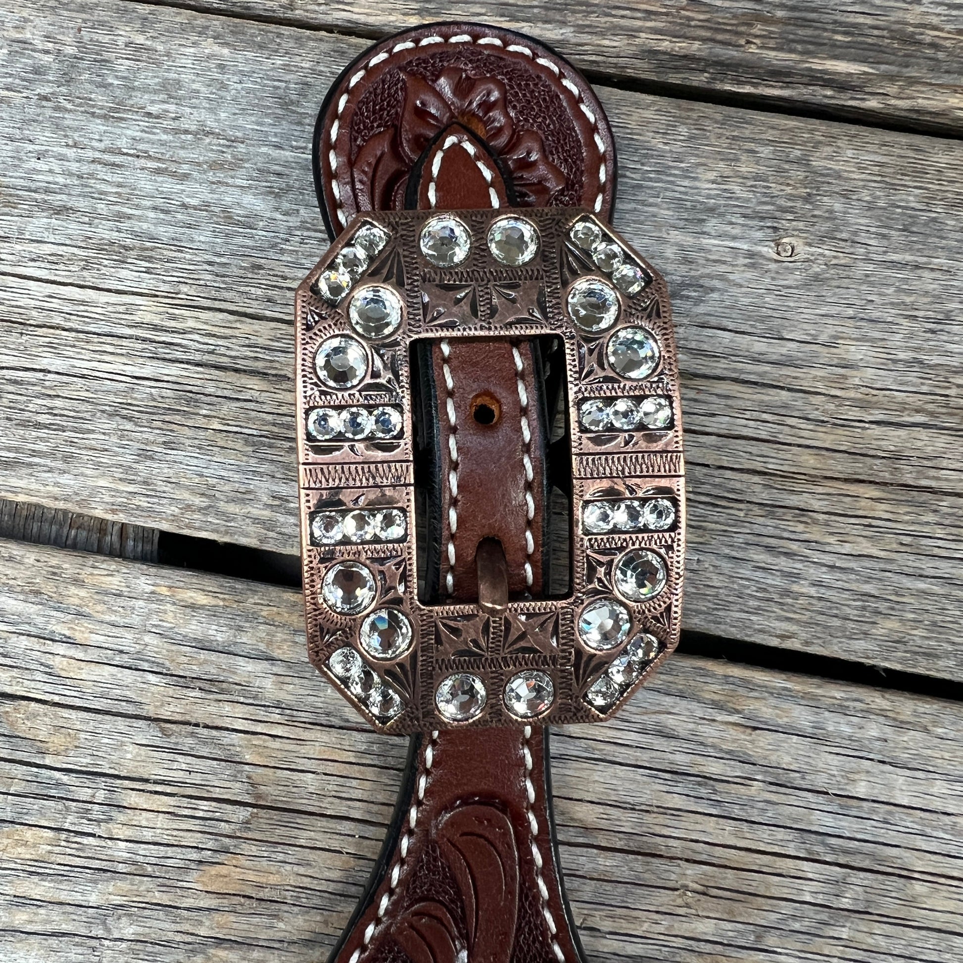 Western style, medium oil floral spur straps. Decorated with copper Clear crystal conchos/buckles.