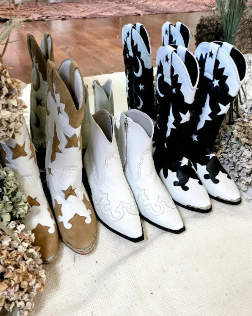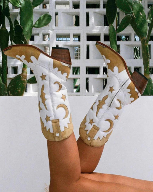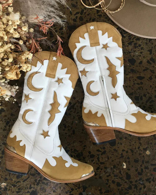 Tan hide suede applique and star & moon cut out's with White Sheep's leather