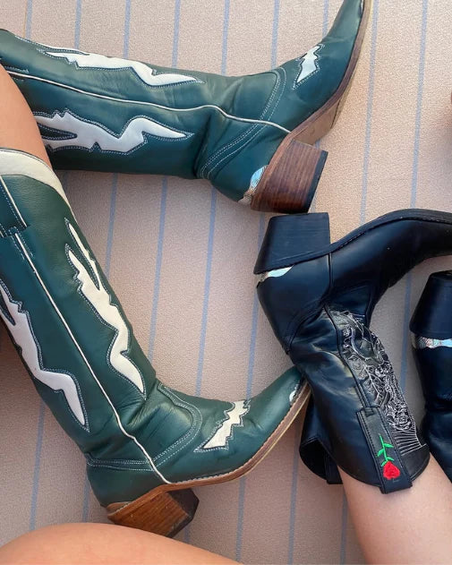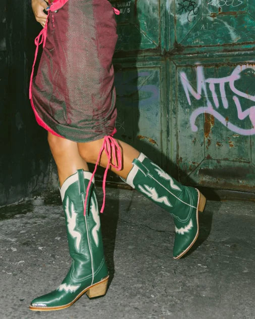 Emerald green High Cowboy Boots with cream accents, cream piping and white stitching