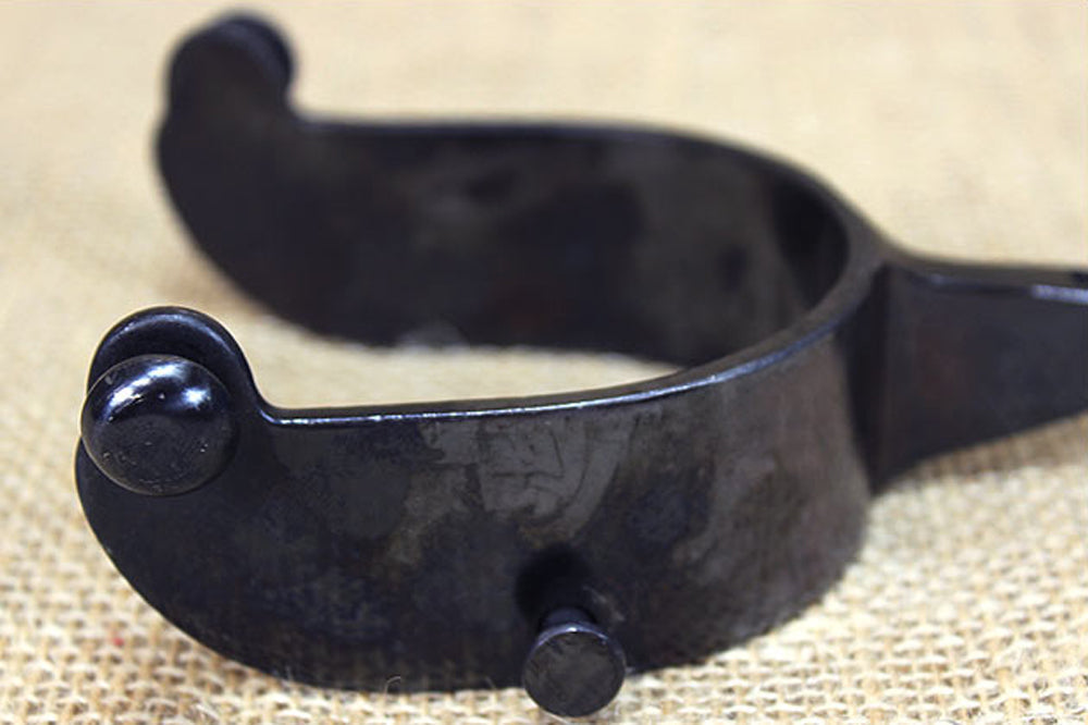 Black Steel Mens Rodeo Spurs 15 Degree Offset 2-1/4 inch Shank Black Steel Rowels and Buttons 1 inch Band 5 Points notched Rowels.