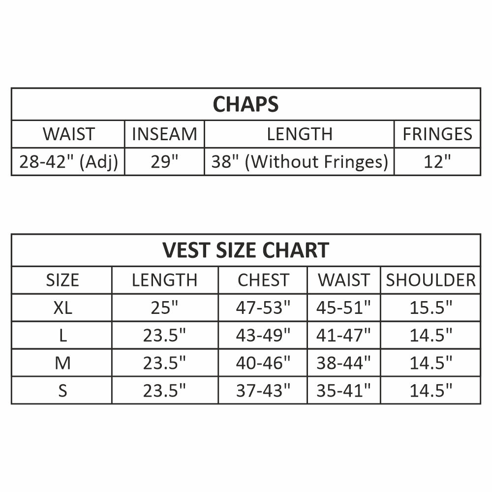 • FEATURES: CHAPS SIZES :- (28-42 In) Waist , (29 In) Inseam, (38 In without Fringes) Length and (12 In ) Fringes. VEST SIZES :- EXTRA LARGE [(25 In) Length, (47 -53 In) Chest, (45-51 In) Waist, (15.5 In) Shoulder], LARGE [(23.5 In) Length, (43 -49 In) Chest, (41-47 In) Waist, (14.55 In) Shoulder],MEDIUM [(23.5 In) Length, (40 -46 In) Chest, (38-44 In) Waist, (14.5 In) Shoulder],SMALL [(23.5 In) Length, (40 -46 In) Chest, (38-44 In) Waist, (14.5 In) Shoulder]
