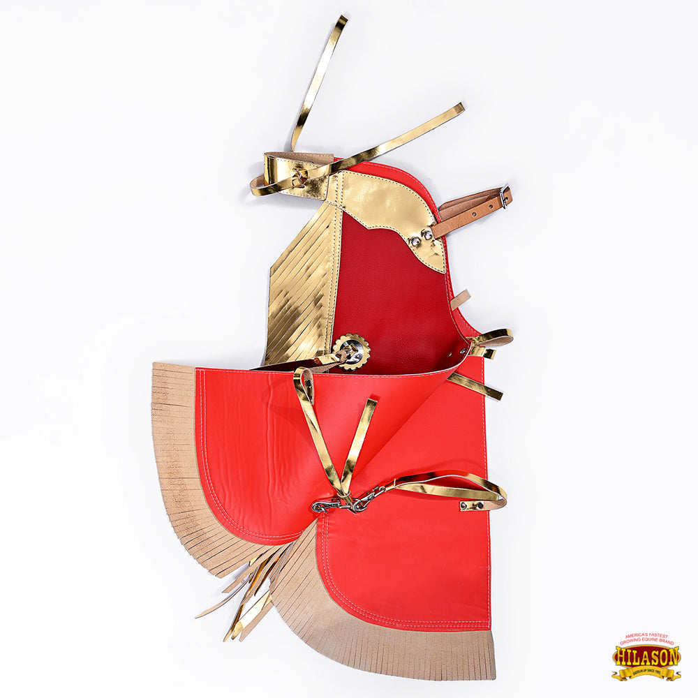 Hilason offers one of the most extensive selections of chaps in the industry, combining unique designs, top-notch quality, and affordability. Each chap is crafted to be visually appealing and eye-catching. Made by skilled artisans using premium materials, our chaps stand out for their attention to detail and durability. Key factors to consider when choosing a chap are its construction quality and durability. Our chaps are thoughtfully designed with reinforced stress points to ensure longevity, using extra material, padding, or stitching where needed. The right weight of the chap is also crucial to provide the ideal balance, fit, and feel. Beyond durability, these chaps are easy to maintain. A soft brush works well for dusting, and for spot cleaning, a damp cloth with mild liquid soap is all you need. HURRY UP!!! Click the "ADD TO CART" button as soon as possible to start enjoying your ride.