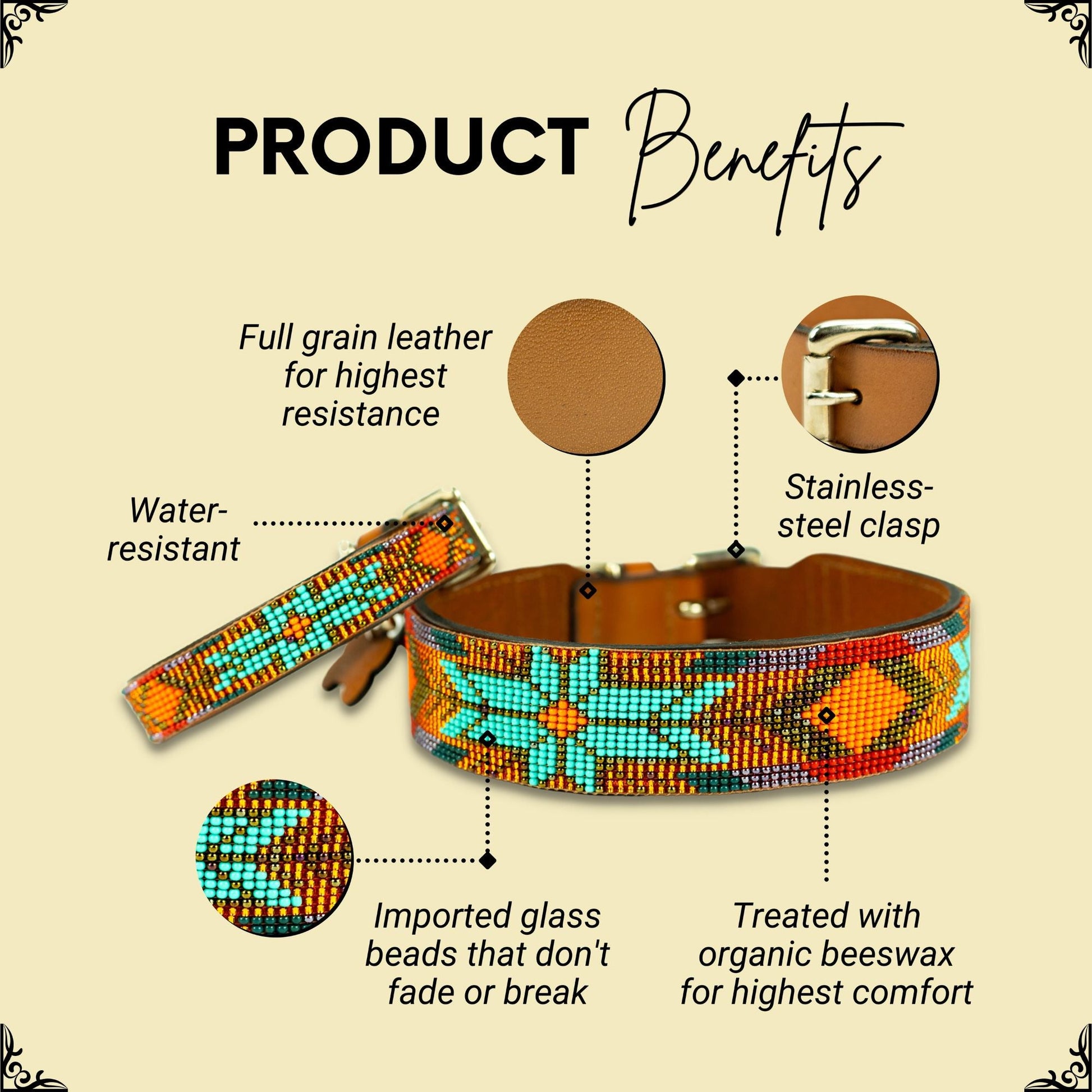 Our dog collars are luxury master pieces, completely unique and handmade by artisan women in Brazil. The vibrant colors, sun reflecting beads and unique design will make your little baby shine. Our pieces use full grain leather which is the highest rating for leather quality. Because full grain leather has the full, complete grain of the hide, it is the most durable leather and is solely used by luxury brands. This feature makes this collar very flexible and comfortable for your fur baby. Our leather is treated with organic beeswax which makes it suitable for outdoor activities such as hiking and the beach. Please note that our leather is purposely un-dyed and very pliable to provide your little pup with the highest comfort. Each bead is made of unbreakable glass and stitched one by one following the ancient Brazilian tradition of “tear beading” to make the stitching indestructible. This stitching method allows for resistance to scratching so you can be assured that the beads will not fall off. The strong buckles are water resistant, so mud and water playdates are allowed. This association of high-end materials combined with artisanal expertise in the manufacturing process make our collars very long lasting and unique. Please note that your purchase will contribute to the sustainable development and empowerment of artisan women from the community of Araxa in Minas Gerais, Brazil.